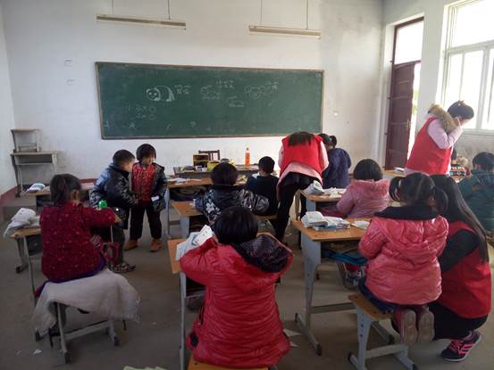 大约下午一点,志愿者们坐车到达了魏庄小学,这里地处乡村,位置比较偏僻,大概正因为如此,这所小学的学生人数并不是很多。等志愿者们下车的时候,这些孩子们都七七八八地围了过来,对我们这些人的到来充满了好奇。看到他们脸上朴实的笑脸,志愿者们的心都被融化了。