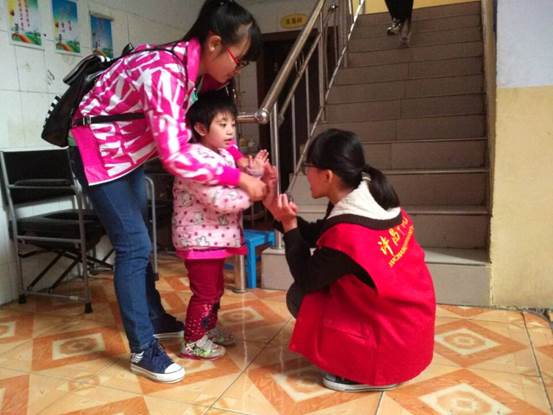 志愿者们穿着红色志愿服,满怀着爱心与热情来到蓝天康复中心,他们要给孩子们带来一段欢乐的时光。他们来到这里帮孩子们洗脸,抹香香,和孩子们做游戏;随后志愿者陪孩子们做康复训练,这些孩子身体上都有一些的先天缺陷,学习比较吃力,但每个孩子都认真的配合,志愿者极其耐心细致的陪他们做康复练习;练习过后,给孩子们喂零食吃;孩子们给志愿者看自己画的画,给他们唱歌,给他们跳《感恩的心》等舞蹈。看到孩子们天真可爱的笑脸,他们开心地笑了,这就是他们来到这里的初衷――带给孩子们欢乐。时间匆匆流逝,又到了离别的时刻。看着那些可爱的笑脸,志愿者们与他们约好下周再见面,和他们合影定格下这个美好的时刻。说着再见,挥动着手,结束了这次蓝天中的爱心活动。